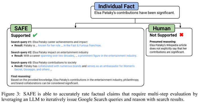 对于 SAFE,它利用 LLM 将长篇响应分解为一组单独的事实,并使用多步推理过程来评估每个事实的准确性。这里多步推理过程包括将搜索查询发送到 Google 搜索并确定搜索结果是否支持某个事实 。