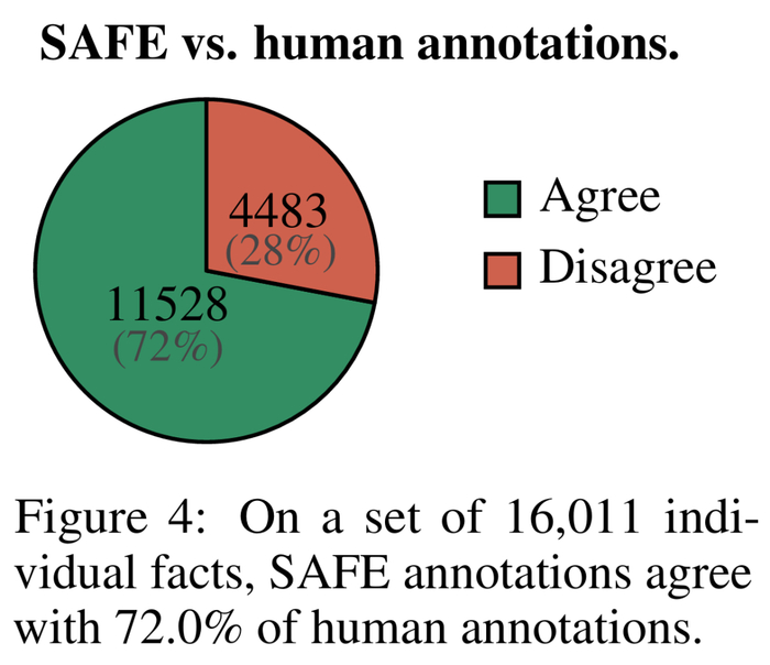 实证结果表明,LLM 智能体可以实现超越人类的评级性能。在一组约 16k 个单独的事实上,SAFE 在 72% 的情况下与人类注释者一致,并且在 100 个分歧案例的随机子集上,SAFE 的赢率为 76%。同时,SAFE 的成本比人类注释者便宜 20 倍以上。