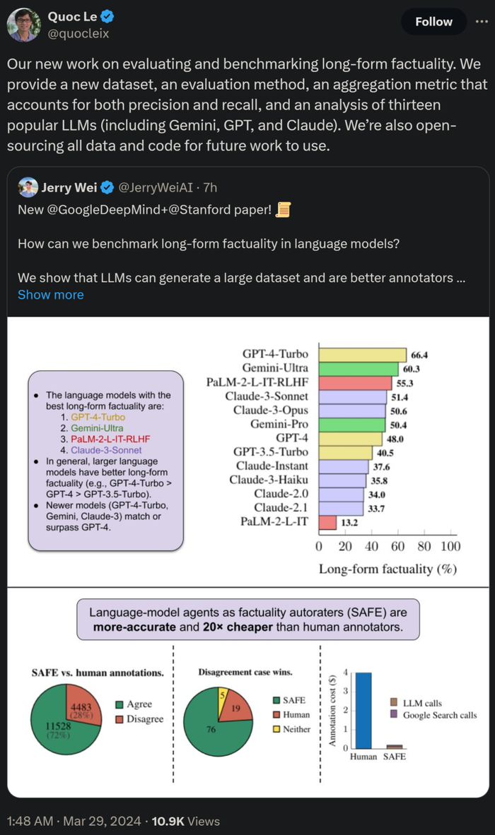 论文作者之一、谷歌研究科学家 Quoc V. Le 表示,这篇对长篇事实性进行评估和基准测试的新工作提出了一个新数据集、 一种新评估方法以及一种兼顾精度和召回率的聚合指标。同时所有数据和代码将开源以供未来工作使用。