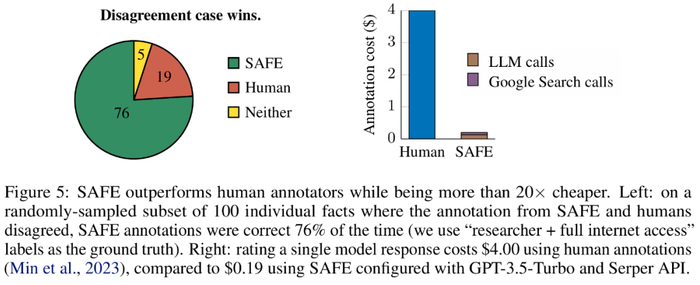 这里,两种注释方案的价格非常值得关注。使用人工注释对单个模型响应进行评级的成本为 4 美元,而使用 GPT-3.5-Turbo 和 Serper API 的 SAFE 仅为 0.19 美元。