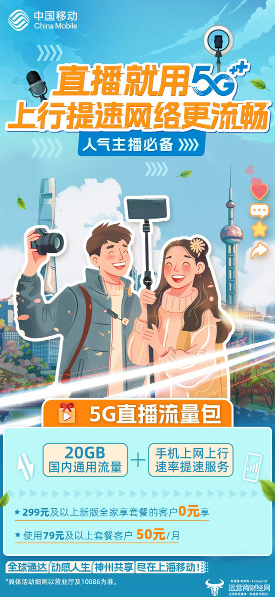 除商用礼包外,上海移动也推出了5G-A相关产品。指定客户可以申请办理5G直播流量包,享20GB国内通用流量和手机上网上行速率提速服务,获得更流畅的直播体验,其中,299元及以上新版全家享套餐客户可免费体验该直播包。