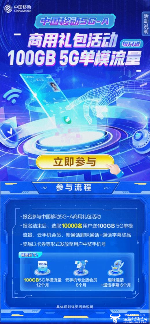 目前,移动5G-A正在面向全国招募体验对象,名额共1万个,3月28至30日,客户可通过中国移动APP免费申请办理5G-A商用礼包,加入5G-A新体验,获得每月100G流量共12个月、云手机专业版会员6个月、趣味通话6个月和来电字幕6个月。
