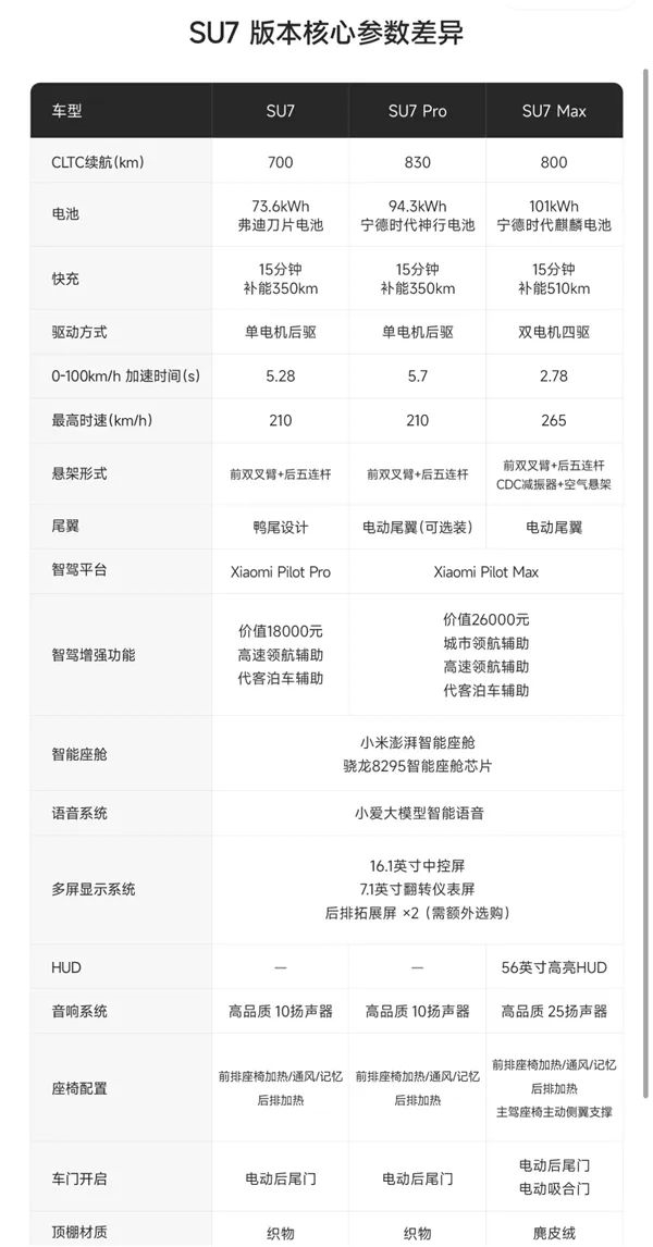 小米SU7推出了三个版本:标准版、Pro版、Max版,售价范围从21.59万到29.99万元不等。