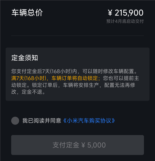 一旦订单锁定,车辆将进入生产阶段,配置无法再修改,定金不退。