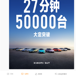 上市即爆火,官方海报显示,上市仅27分钟,小米SU7大定破50000台。