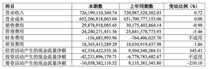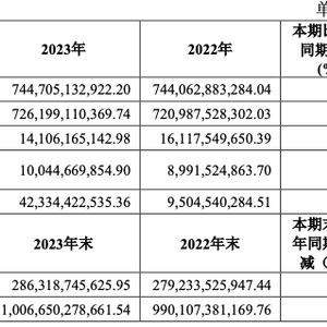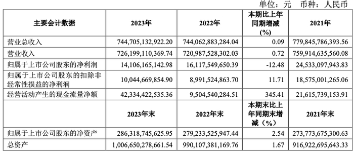 财报显示,2023年上汽集团营业总收入为7447.05亿元,同比增长0.09%;归属于上市公司股东的净利润为141.06亿元,同比下降12.48%;扣非净利润100.4亿元,同比增长11.71%;经营活动产生的现金流量净额为423.34亿元,同比增长345.41%;上汽集团基本每股收益为1.226元,加权平均净资产收益率为4.98%。拟每10股派送现金红利3.69元(含税),合计派发42.3亿元(含税)。