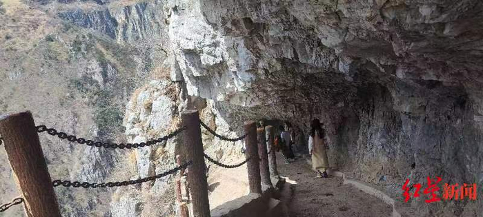 2003年,古路村从石壁上凿出的一条长约3000米、垂直高度近1000米的骡马道,成为与外界交流的唯一通道。沿着悬崖螺马道行走,全程耗时两三个小时,可达山顶。