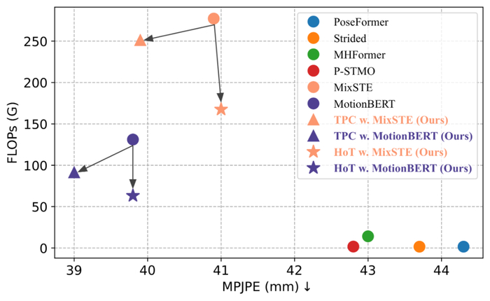 来自北京大学的团队提出了一种基于沙漏 Tokenizer 的高效三维人体姿态估计框架HoT,用来解决现有视频姿态 Transformer(Video Pose Transformer,VPT)高计算需求的问题。该框架可以即插即用无缝地集成到 MHFormer,MixSTE,MotionBERT 等模型中,降低模型近 40% 的计算量而不损失精度,代码已开源。
