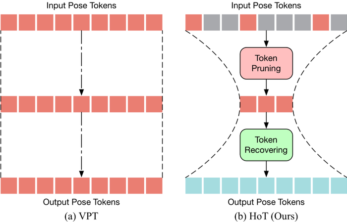 HoT是第一个基于 Transformer 的高效三维人体姿态估计的即插即用框架。如下图所示,传统的 VPT 采用了一个 “矩形” 的范式,即在模型的所有层中维持完整长度的 Pose Token,这带来了高昂的计算成本及特征冗余。与传统的 VPT 不同,HoT 先剪枝去除冗余的 Token,再恢复整个序列的 Token(看起来像一个 “沙漏”),使得 Transformer 的中间层中仅保留少量的 Token,从而有效地提升了模型的效率。HoT 还展现了极高的通用性,它不仅可以无缝集成到常规的 VPT 模型中,不论是基于 seq2seq 还是 seq2frame 的 VPT,同时也能够适配各种 Token 剪枝和恢复策略。