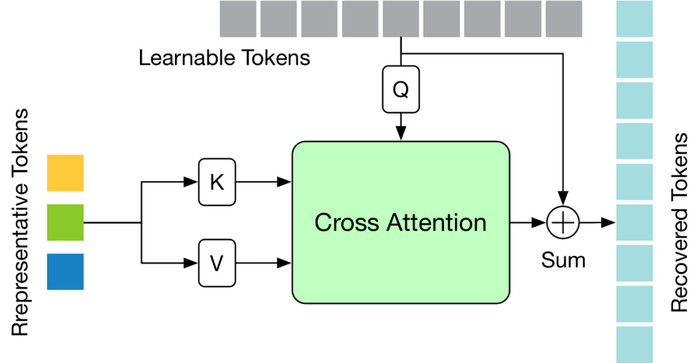TRA 模块的结构如下图所示,其利用最后一层 Transformer 中的代表性 Token 和初始化为零的可学习 Token,通过一个简单的交叉注意力机制来恢复完整的 Token 序列。