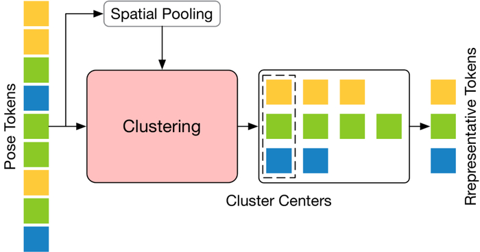 TPC 的结构如下图所示,它先对输入的 Pose Token 在空间维度上进行池化处理,随后利用池化后 Token 的特征相似性对输入 Token 进行聚类,并选取聚类中心作为代表性 Token。
