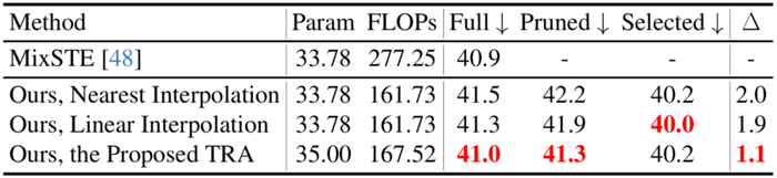 为了解决上述挑战,本文设计了一个轻量级的 Token 恢复注意力(Token Recovering Attention,TRA)模块,它能够基于选定的 Token 恢复详细的时空信息。通过这种方式,由剪枝操作引起的低时间分辨率得到了有效扩展,达到了原始完整序列的时间分辨率,使得网络能够一次性估计出所有帧的三维人体姿态序列,从而实现 seq2seq 的快速推理。