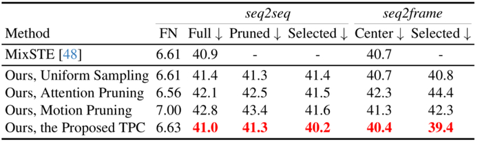 Seq2seq 的推理:一个实际的三维人体姿态估计系统应当能够通过 seq2seq 的方式进行快速推理,即一次性从输入的视频中估计出所有帧的三维人体姿态。因此,为了实现与现有 VPT 框架的无缝集成并实现快速推理,需要保证 Token 序列的完整性,即恢复出与输入视频帧数相等的全长 Token。