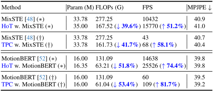 HoT揭示了维持全长的姿态序列是冗余的,使用少量代表性帧的 Pose Token 就可以同时实现高效率和高性能。与传统的 VPT 模型相比,HoT 不仅大幅提升了处理效率,还实现了高度竞争性甚至更好的结果。例如,它可以在不牺牲性能的情况下,将 MotionBERT 的 FLOPs 降低近 50%;同时将 MixSTE 的 FLOPs 降低近 40%,而性能仅轻微下降 0.2%。