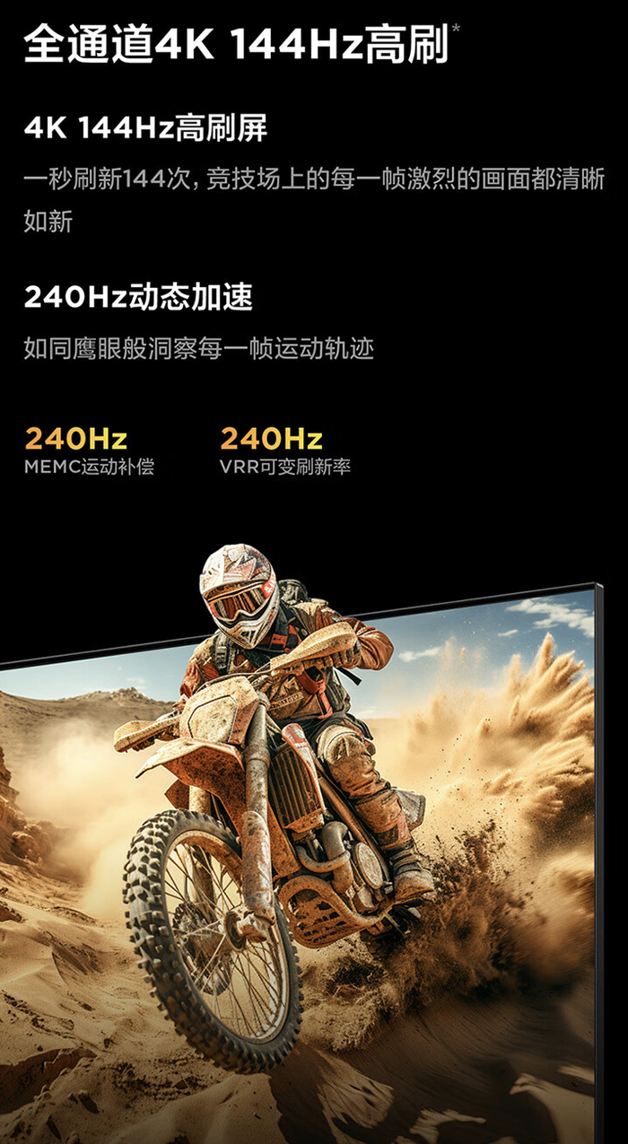 据介绍,系列电视配备 4K 144Hz VA 面板,亮度提升至 450 尼特,支持 240Hz MEMC 运动补偿及 240Hz 可变刷新率,支持 HDR10,覆盖 93% DCI-P3 色域。