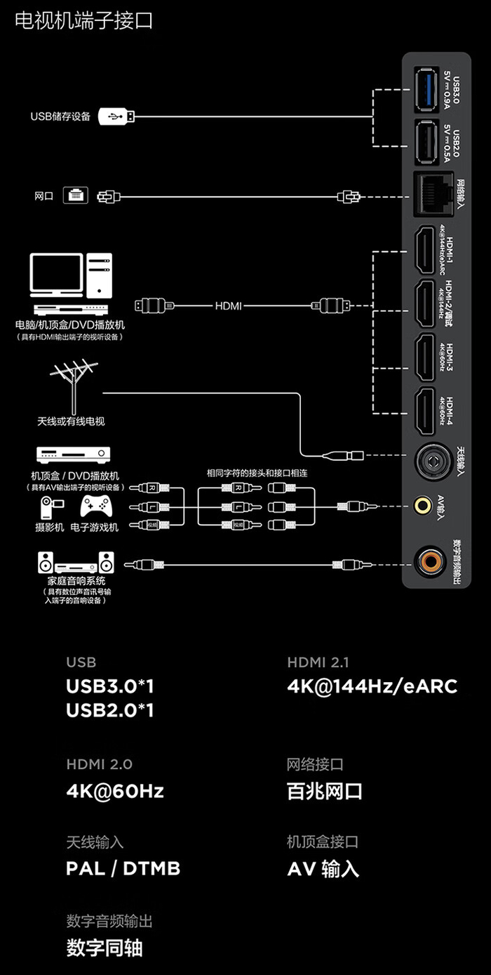 此外,这款电视配备 30W 四单元音响,搭载 MT9653 芯片,4GB RAM 及 64GB 存储空间,支持蓝牙 5.2,拥有 2 个 HDMI 2.1 接口、2 个 HDMI 2.0 接口、1 个 USB-A 3.0 接口、1 个 USB-A 2.0 接口、1 个 AV 输入接口、1 个 RJ45 接口。