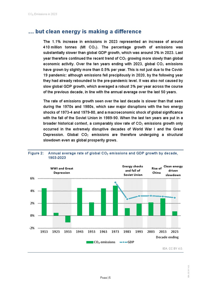 由于越来越多的清洁能源部署,碳排放正在出现结构性放缓。在截至2023年的十年间,全球温室气体排放量的年增长率略高于0.5%,是自大萧条以来的最低水平。