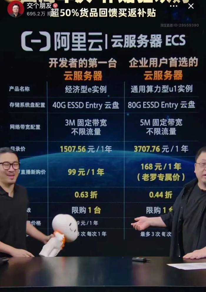 在价格上,云服务器ECS经济型e实例售99元/年,与官网一致,而直播间的“老罗专属价”更具吸引力,通用算力型u1实例只卖168元/年,阿里云对象存储OSS和阿里云盘企业版2TB均售199元/年。其中168元包年的企业首选云服务器u1实例被有需要的用户疯抢,阿里云只得重新上架。该次直播是交个朋友直播间首次销售阿里云服务,也是阿里云自今年2月降价动作之后又一次的优惠活动。在今年2月29日,阿里云宣布100多款产品、500多个产品规格的官网价格平均降低20%,最高降幅55%,降价后,阿里云核心产品价格击穿了全网最低价。而“老罗专属价”进一步释放优惠力度。罗永浩也笑称,“这几款产品折扣很大,价格很实惠,不赚钱只跟大家交个朋友。”不过,与其说是罗永浩想交个朋友,倒不如说是和阿里云交个朋友。对于这次卖云计算的原因,罗永浩称和其他选品的逻辑一样,以解决实际需求为出发点。在罗永浩看来,云计算已经成为一项很有必要的支出。直播时,罗永浩介绍了云计算的市场背景,“中国公共云渗透率28%,一些企业由于历史惯性等原因,自己买服务器自己架,其实不如用云计算,可以说云计算就是创新创业的优质土壤。”但罗永浩随即补充道,“说的克制了,我觉得是必备的土壤。”罗永浩此次直播,选品涵盖了云服务器、云存储及企业网盘等热门阿里云产品,目标客户就是创业者及中小企业群体。近年来,随着云计算规模逐渐增长,云计算的成本也在逐年下降。国内其他云服务商,已经经历了几轮价格战,目的就是为了竞逐市场规模。因为用户越多,成本越低。过去十年阿里云将计算成本降低了80%,存储成本下降了近90%。这次直播,已经帮阿里云吸引到一些创业者和中小企业,这也是阿里云未来想要的中长尾用户。推荐创业者“上云”,老罗是位好人选在此次直播的预热视频中,有这样一段话,“最近有创业者朋友给我留言求助,公司IT部分成本高,支出昂贵,问题多难处理,技术人员水平参差。其实解决办法很简单,就是上云。”罗永浩能够被创业者信任,并且在创业者群体中保持较高人气,很重要的原因就是他的创业者身份。据了解,罗永浩在2006年6月离开新东方后,一个月后发起创办的牛博网正式开张;2008年,罗永浩回归教育赛道,创办“老罗和他的朋友们教育科技(北京)有限公司”;2012年5月,罗永浩创办锤子科技;2020年,罗永浩进军直播带货;2022年,罗永浩进军AR领域,官宣其新创业公司名为“Thin Red Line”。几经起落,罗永浩仍旧没有放弃创业的信念,即便之前背负巨额债务,仍能重新规划方向,罗永浩也因此收获不少粉丝。阿里云或许也是看中这一点。此次罗永浩的直播卖云,不仅向公众普及了云计算的发展和应用,阿里云也通过这场直播吸引了更多人的关注,进一步扩大阿里云的品牌影响力,让对云计算感兴趣但尚未真正接触到云计算的用户,成为阿里云的潜在用户。并且,罗永浩在直播时透露,他本身就是阿里云的资深用户。他在2012年创办锤子科技时,以及现在的交个朋友直播,都有阿里云在背后的支撑。罗永浩直言,当时锤子科技的很多内置软件就是搭建在阿里云上的,在当初节省了很多成本,并且提高了开发效率。在直播活动海报上,有这样一句话,“创业就要该省的省,该花的花!”对于初创企业来说,创业本就是九死一生,在实现盈利前,每一笔开支都是骆驼身上的稻草。如今,云计算为他们省下了服务器租赁、以及运营和管理成本,并且提高了效率。此次直播,阿里云为了给中小企业提供更多支持,增加了多款产品的免费额度,进一步降低了上云的门槛。据钛媒体报道,罗永浩这次还有一个“阿里云首席云大使”的身份,直播主题为“为创业者选的云,就是阿里云”。这次在“交个朋友”上的尝试,是阿里云淘宝旗舰店之后,阿里云和淘宝业务合作的新路径。但B端产品与C端产品不同,B端产品做直播也是如此。B端直播更是一个技术含量高,有一定的准入门槛。在过去,B端直播的场均观众可能都没有几个,在淘宝上,阿里云自己的官方旗舰店也只有7万多粉丝。虽然阿里云官方并未公布此次直播的成果,但如果罗永浩这次成绩亮眼,这对阿里云B端产品的业务开拓也提供了有益参考。阿里云的压力与新思路罗永浩直播卖云背后,是阿里云不可忽视的压力与挑战。虽然是中国最大的云厂商,但根据IDC,2023年Q3,阿里云在中国公有云市场占有率为26.7%,同比下降5.8个百分点,份额不断被竞争者蚕食。当前的阿里云有着不可忽视的压力。降价是阿里云最直接的打法。阿里云在今年2月的新一轮降价,几乎覆盖所有核心产品,包括ECS、数据库、存储等使用最广泛的产品,新老同享,官网直降,覆盖最广泛人群。在渠道方面,阿里云针对聚焦于七大关键核心产品的销售增长表现设置了爬坡和增长激励。同时,今年还增加新客户和沉默客户的激励机制。阿里云方面此前也表示,此次大规模降价是为了发挥云计算的规模效应,同时希望加速更多企业,(尤其)中小企业上云。但价格战中的友商也不示弱,京东云更是直接让用户全网比价,因此降价抢客户的效果比较有限。这时候,阿里云就需要一些新思路,找罗永浩就是其中一个重要的尝试。同时,其中也透露了阿里云的新战略意图。在经历2023 年的组织变革和战略调整后,阿里将战略重心放在云服务和电商两大核心业务上,而这两项业务也是受到挑战最大的,电商领域