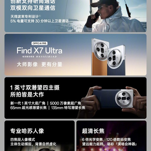 在电池方面,Find X7 Ultra配备了等效于5000mAh的电池,并支持最高100W有线快充技术。摄像头方面,该机搭载了双潜望四主摄系统,支持四焦段专业哈苏人像模式拍摄,同时也是唯一支持6X人像模式拍摄的手机。