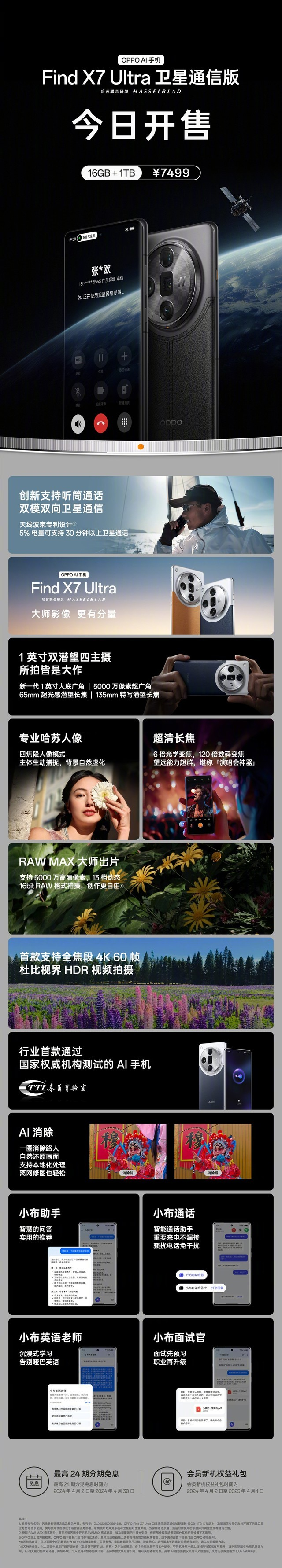 OPPO Find X7 Ultra卫星通信版今日开售,售价7499元
