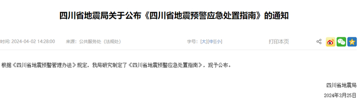 《四川省地震预警应急处置指南》公布