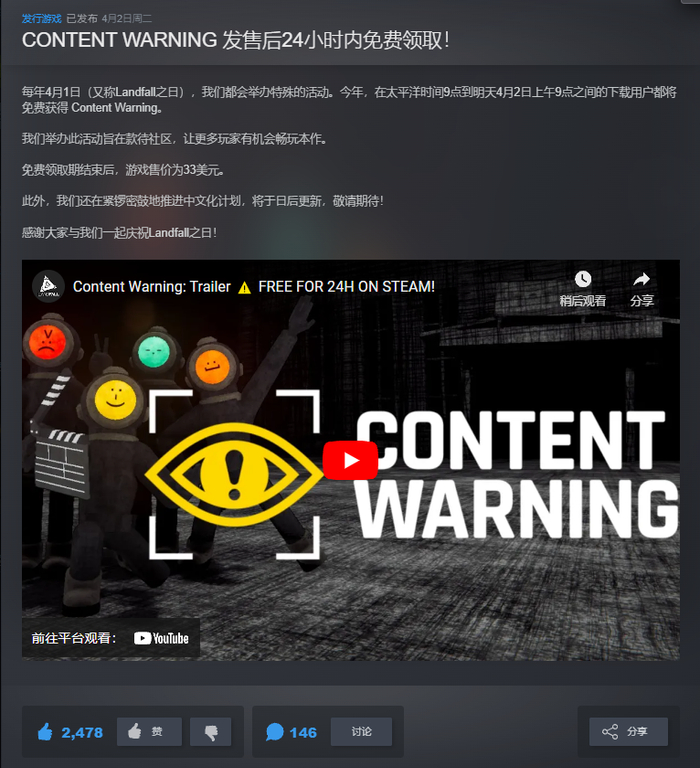 由瑞典工作室Landfall Games发行的多人合作恐怖游戏《内容警告》(Content Warning),刚刚上架Steam,就开放了限时免费领取,截至4月3日上午12时。