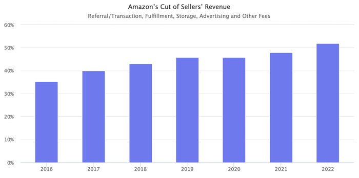 根据Marketplace Pulse研究,卖家每年支付的费用占其销售额的比例越来越高。