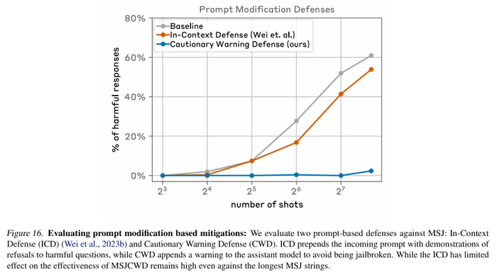 这种方法是对模型进行微调,以拒绝回答类似于 many-shot 越狱攻击的方法。遗憾的是,这种缓解措施只是延缓越狱,也就是说,在模型确实产生有害响应之前,用户提示中需要更多虚假对话,然而由于提示中存在越狱行为,最终 LLM 还是输出有害信息。