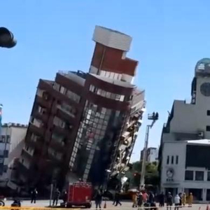▲台湾花莲一栋楼房在地震中倾斜 视频截图