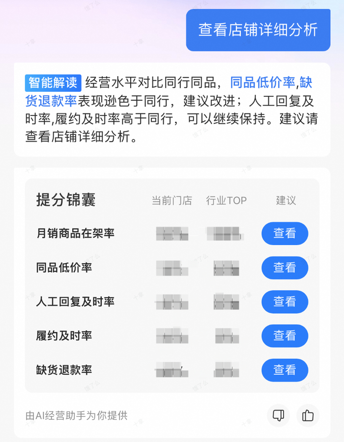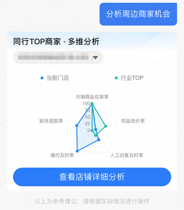 据介绍,通过“AI经营助手”,商家可以根据具体门店查询对应商圈,找到周边经营TOP门店,在月销商品在架率、缺货退数率、商品低价率、履约及时率、人工回复及时率五个方面进行比对。这些分析可以为门店管理者提供运营优化建议和订单增长的最快途径。
