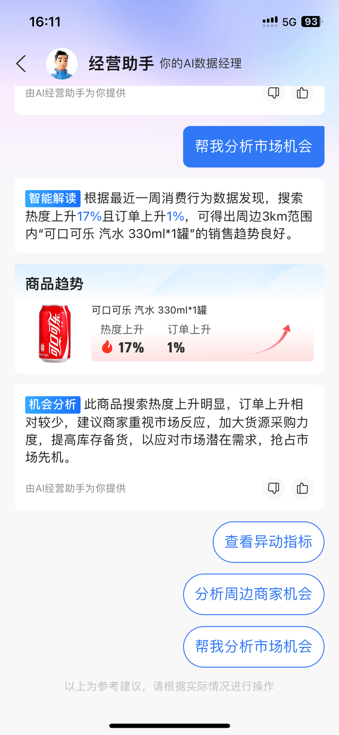 贝库便利则表示,虽然其经营门店数量不多,但在使用AI经营助手后感到“周报和数据异动很有帮助”,能够让商家从繁杂指标中快速提炼有效指标并归纳,数据和建议的呈现也都很直观。