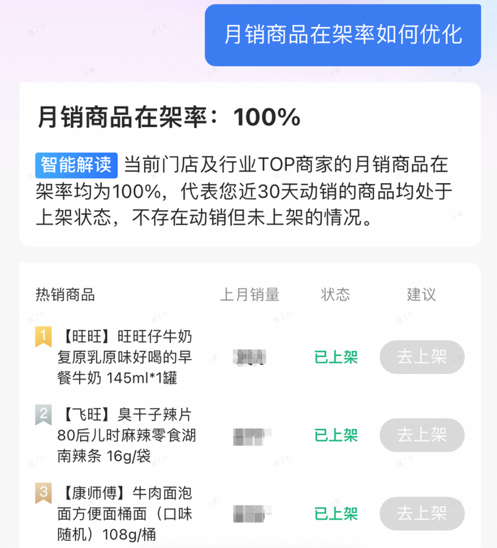此外,“AI经营助手”还可以挖掘门店所处商圈中机会最大的商品,为商家提供商品机会分析和选品建议。与此同时,AI也会根据数据为经营者提供对应的销售策略。
