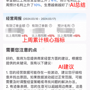 这款由人工智能技术驱动的经营管理工具,集成了先进的自然语言处理、智能决策支持以及深度学习能力,可以为商家提供包括周报推送、指标异动归因、竞对商家对齐、市场趋势选品等在内的全方位经营服务。