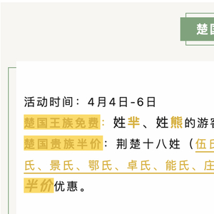 该景区发布的门票优惠政策称,4月4日至6日,楚国王族免费:姓芈、姓熊的游客可免费入园参观;楚国贵族半价:荆楚十八姓(伍氏、屈氏、项氏、蓝氏、麻氏、钟氏、左氏、靳氏、景氏、鄂氏、卓氏、能氏、庄氏、慎(真)氏、敖氏、荆氏、红氏、上官氏)享半价优惠。