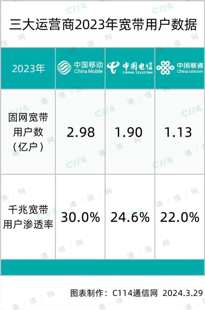 图:2023年三大电信运营商移动用户/固网宽带用户数据对比。制图版权@C114。