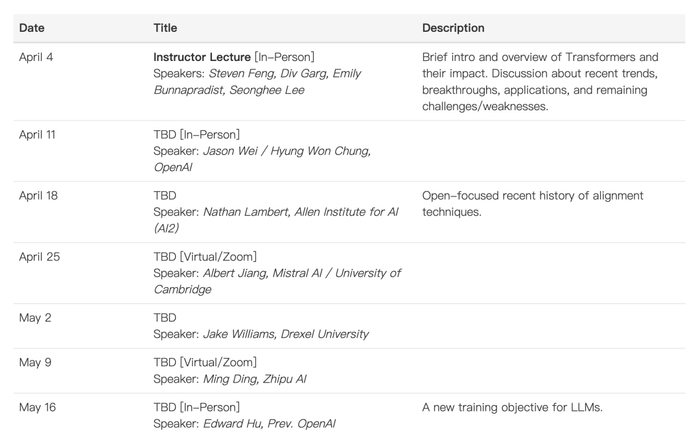 目前已经确定的嘉宾有:OpenAI 的 Jason Wei / Hyung Won Chung、Edward Hu,艾伦人工智能研究所 (AI2) 的 Nathan Lambert,Mistral AI / 剑桥大学的 Albert Jiang 和来自中国公司智谱 AI 的丁铭博士。