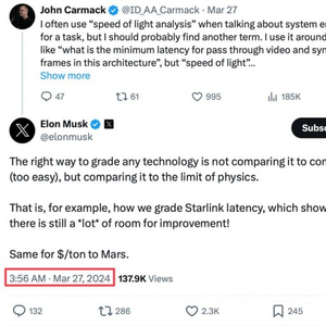 对任何技术进行评分的正确方法,不是将其与竞争对手进行比较(因为这太容易了),而是将其与物理极限进行比较。 例如,我们如何对 Starlink 延迟进行评分,这表明仍然有很多改进空间!飞往火星的成本价格同理。