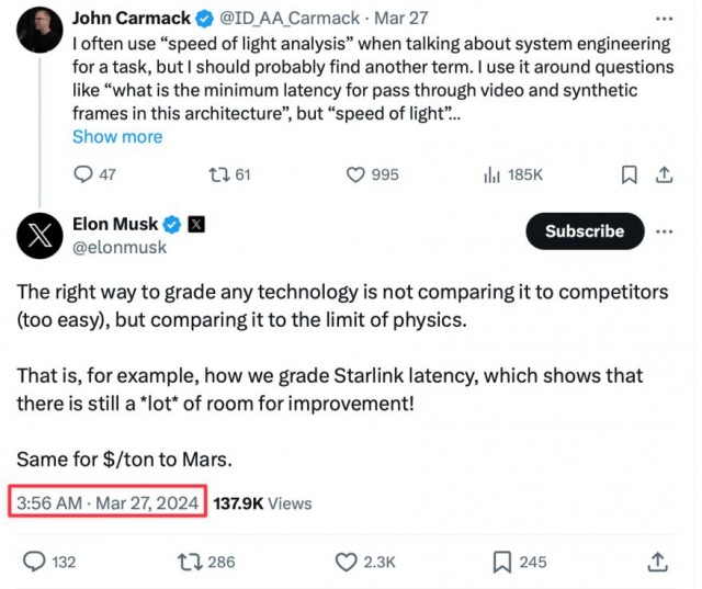 首先,马斯克这条 Twitter 是在北京时间 3 月 27 号凌晨 3:56 发的这条消息,当时小米还没有开 SU7 发布会;