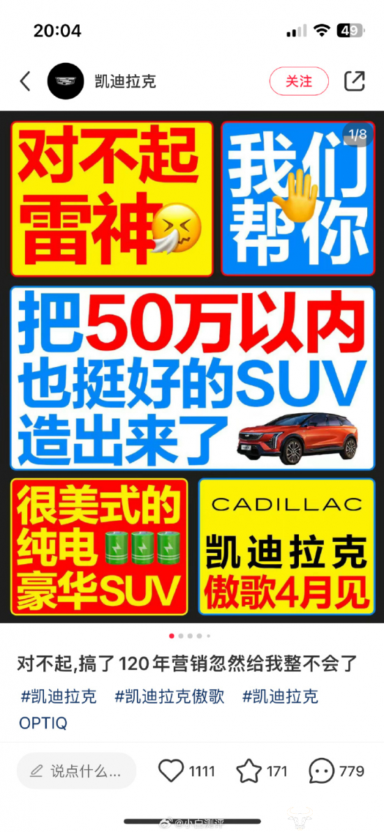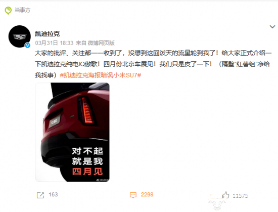 日前,“凯迪拉克”官方账号公开发布一系列海报,被质疑暗讽小米SU7。后来,“凯迪拉克”在另一平台表示“我们只是皮了一下”。在小米SU7热度正盛的时候,“凯迪拉克”这种行为被网友认为是蹭流量。