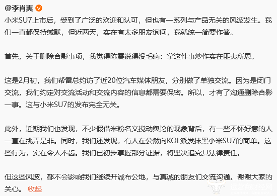 值得一提的是,针对该汽车博主删除与小米创始人雷军合影一事,小米汽车副总裁李肖爽公开表示“关于删除合影事项,我觉得某某说得没毛病:拿这件事炒作实在匪夷所思。”