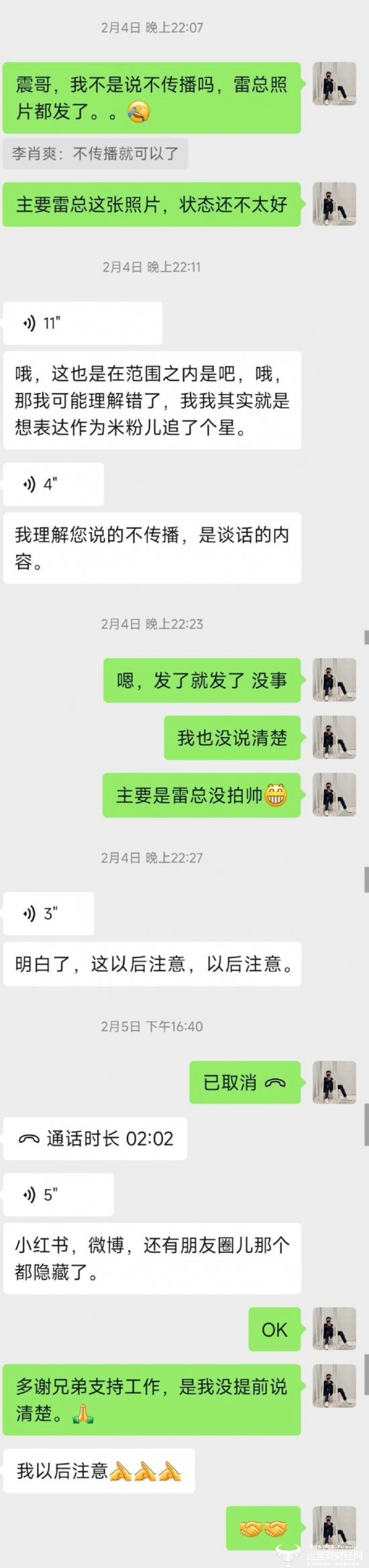 从李肖爽披露的聊天记录看,汽车博主误以为小米方所强调的“不传播”,是谈话内容不传播。实际上,包括与雷总合照在内,小米方都不希望传播。而后小米方与汽车博主取得联系,表示希望能删除合影。