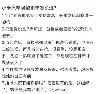 也就是说,事实上,并不存在小米汽车不退定金的问题,是一批网友“误触”锁单后,不想继续订购小米SU7,而根据小米汽车相关规定,锁单后就不能退定金。