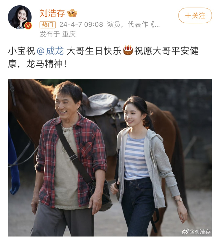 今天一早,曾在电影《龙马精神》中扮演成龙女儿“小宝”的演员刘浩存发文:“小宝祝成龙大哥生日快乐,祝愿大哥平安健康,龙马精神!”