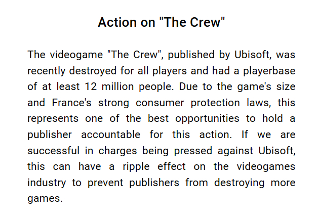 经过数个月的筹备,Scott和他的团队终于把各国法律条文研究了个遍,4月3日,Scott创建了“停止杀死游戏”网站,发起了消费者维权活动,号召全球各地的《飙酷车神》玩家签署请愿书,并向法国消费者保护机构DGCCRF等监管机构提交投诉。