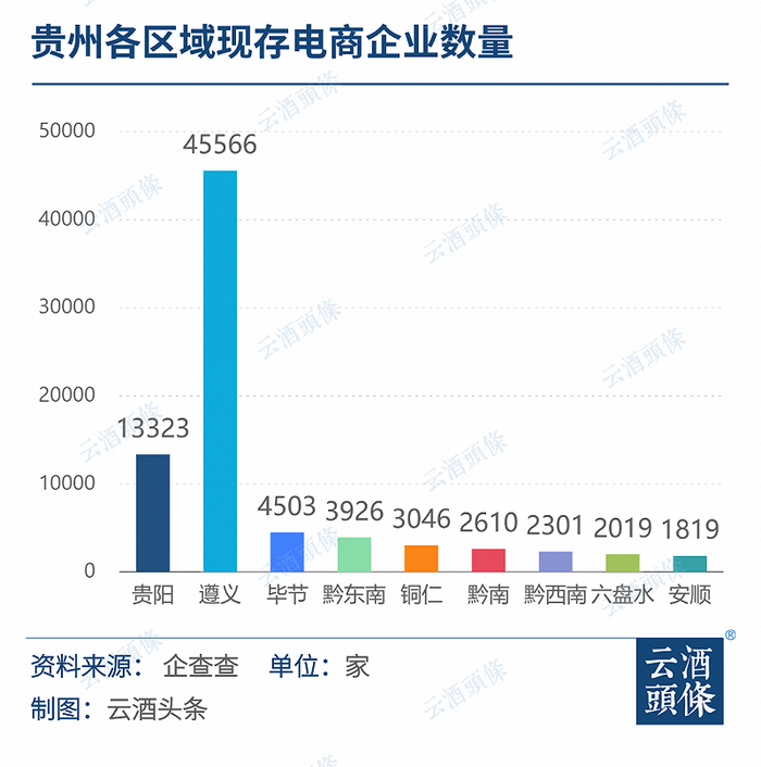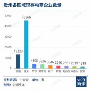 遵义作为酱酒主产区,截至3月14日,现存电商企业数量为4556家,是除贵阳外贵州省内电商企业最多的地区。毕节市、黔东南、铜仁市、黔南、黔西南、六盘水市、安顺市这一数据分别为4503、3926、3046、2610、2301、2019、1891家。可以明显看出,在贵州省内,酱酒企业的聚集地也是电商企业的主要聚集地。