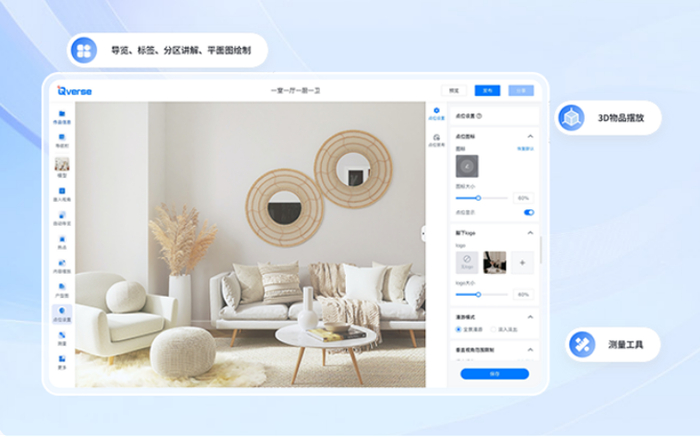 在构建数字空间之外,Qverse三维空间云平台更在意的是如何通过数字空间满足用户的个性化需求。因此,在具体功能设计上,涵盖了营销传播及垂直行业的各类精细化领域的空间数字化需求,真正实现从空间建模到空间编辑再到行业应用的全链路空间管理。