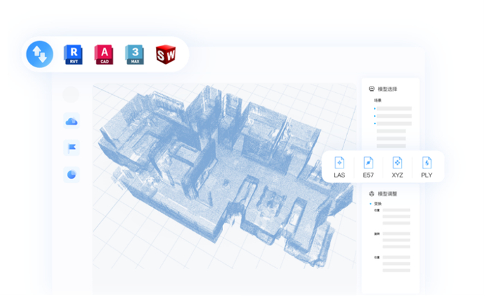 同时,可开放集成第三方三维模型、全景照片、虚拟模型、倾斜摄影模型等多元数据,支持Ply、E57、XYZ、LAS等点云格式文件导出,无缝衔接BIM/CAD等专业软件,真正让行业用户能够有所选,有所用。