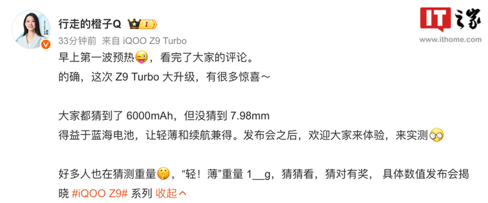 iQOO 产品经理 @行走的橙子 Q 在微博上表示,该机虽然采用 6000mAh 蓝海电池,但仅有 7.98mm 厚,甚至重量也控制在了 200g 以内,具体的重量数据将在发布会揭晓。