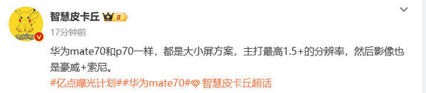 【CNMO科技消息】目前,华为P70系列随时有可能通过先锋计划上架华为官方商城,这一最新旗舰牵动着无数“花粉”的视线。而近日,CNMO注意到,爆料人士“智慧皮卡丘”放出了华为Mate70系列的最新消息。