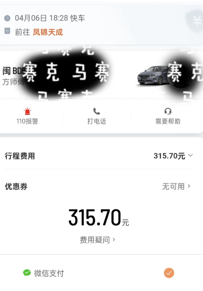 一位来自重庆的滴滴用户刘女士对蓝鲸记者说到:“我的这笔异地订单是4月6日出现的,打车地点位于福建省。当天晚上突然就收到一则电话,叫我系好安全带。离奇的是这笔订单并非我本人操作的,当时我尝试联系司机,司机也不理我。行程结束时显示需要支付315元费用。”